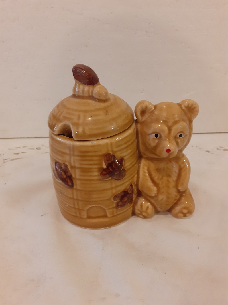 Aardewerk honingpotje met bijtjes en een beertje in goede staat. Hoogte 13 cm, breedte 12 cm.