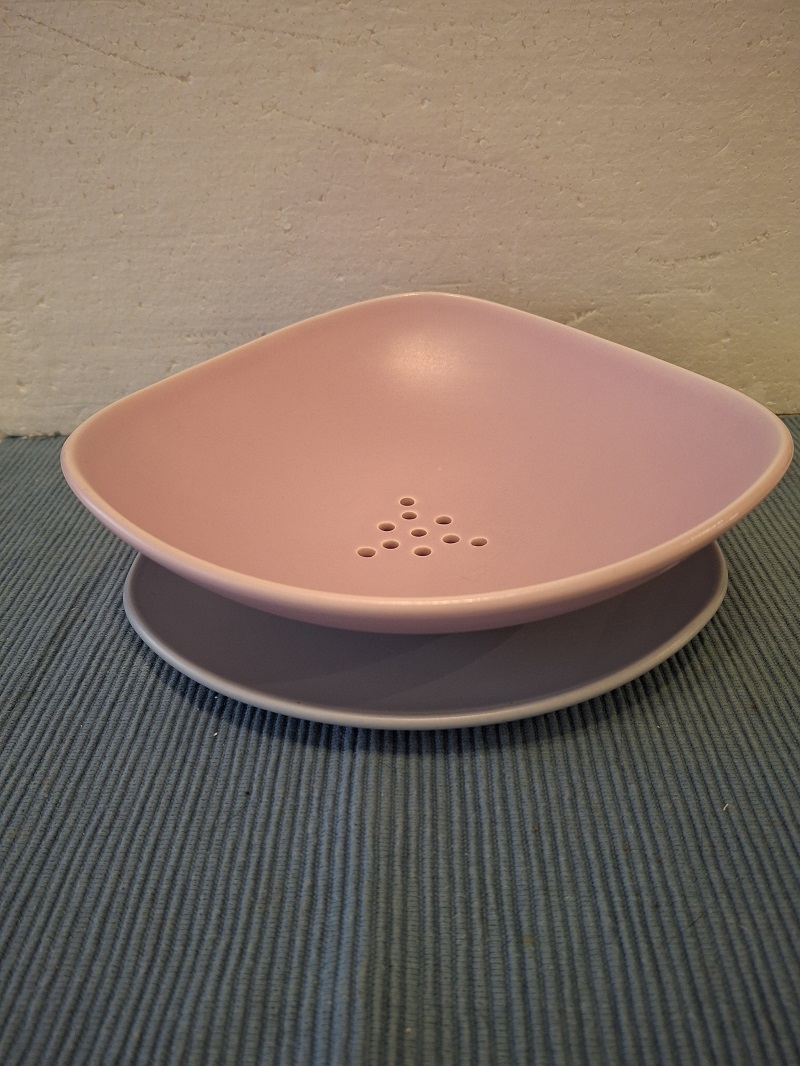 Pastelroze aardewerk fruittest & zachtgrijs onderbord – Flora Gouda ?